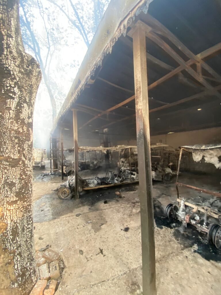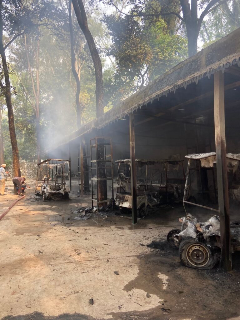 Zirakpur (Gurpreet Singh): A major fire broke out at Chhatbir Zoo this morning around 8 a.m., reducing around 18 electric rickshaws to ashes. According to zoo staff, the blaze started suddenly in the parking area where the e-rickshaws were stationed. Within minutes, the fire spread rapidly, engulfing all the parked vehicles.