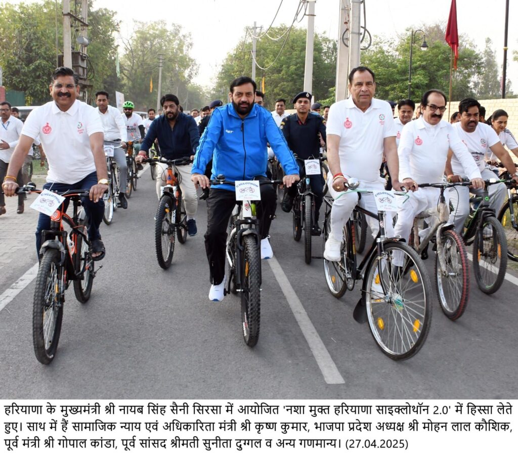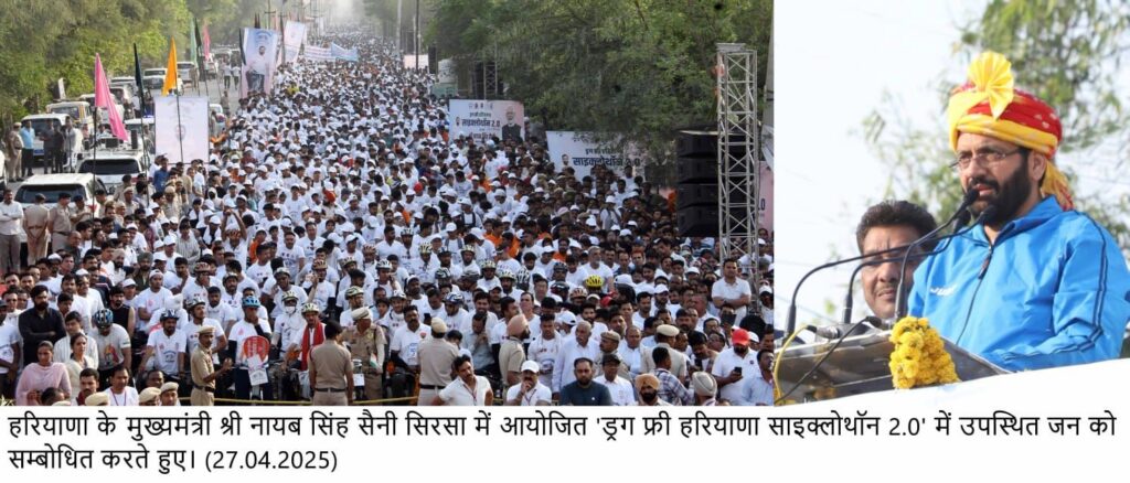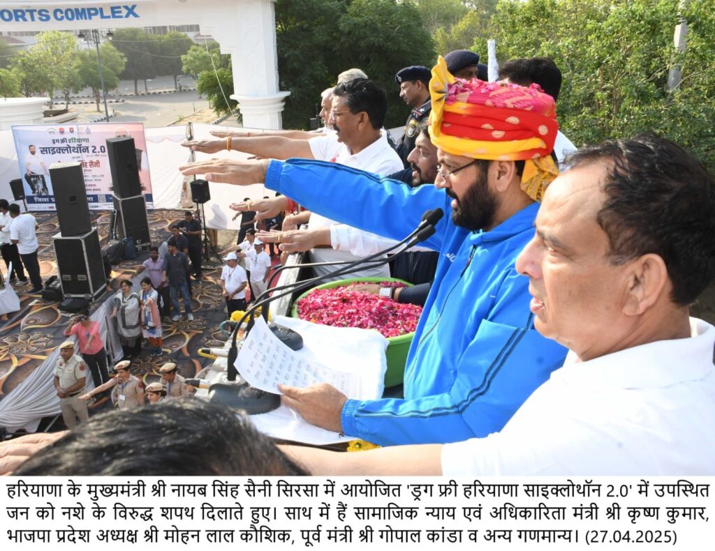 Chandigarh, April 27 – Haryana Chief Minister Nayab Singh Saini called upon the saint community, khap panchayats, sarpanches, and the people of the state to rise above political differences and unite in empowering the youth of Haryana. Flagging off the ‘Drug-Free Haryana Cyclothon 2.0’ in Sirsa, he emphasized that realizing the dream of a developed India and a developed Haryana is possible only by making the state drug-free.