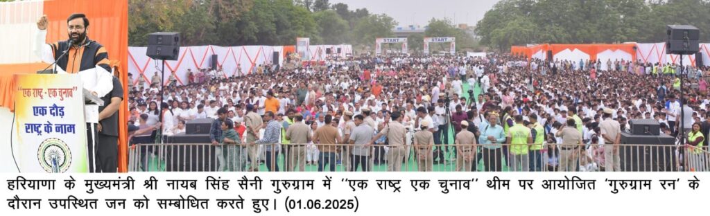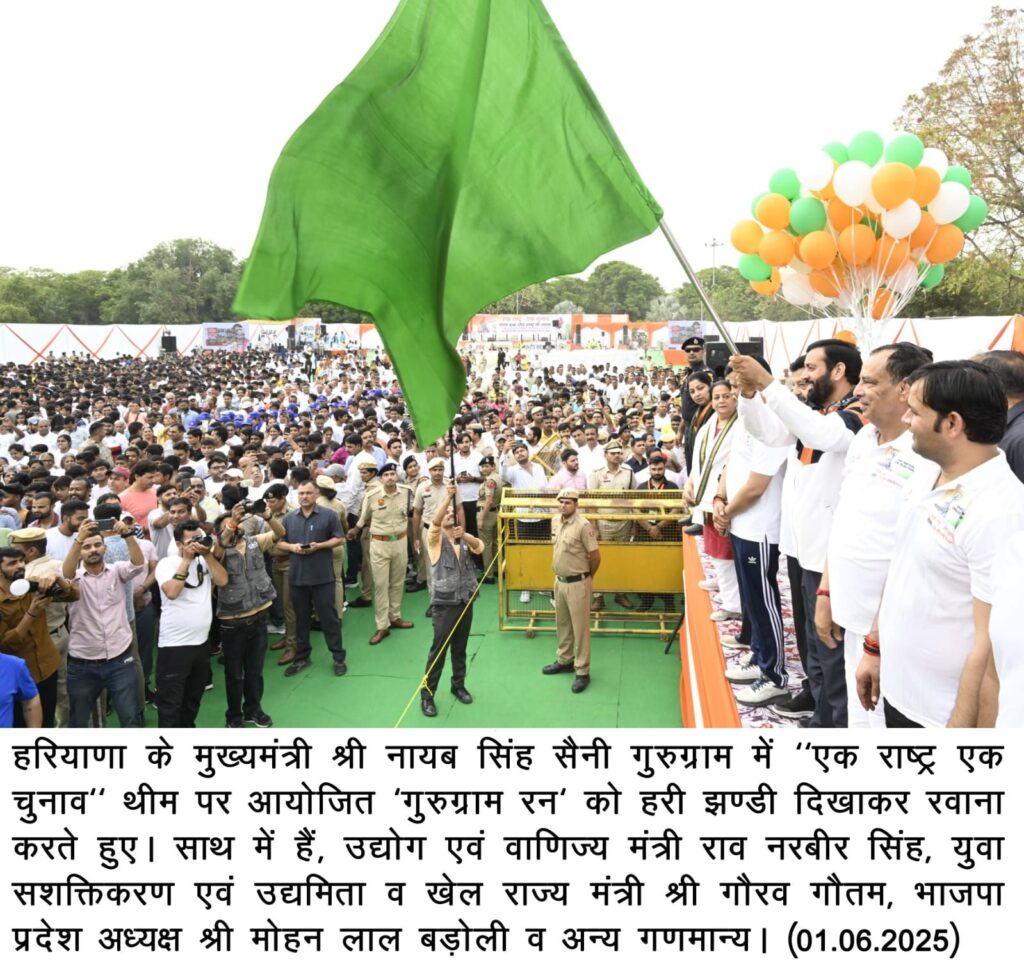 Gurugram, June 1, 2025: Haryana Chief Minister Nayab Singh Saini on Sunday emphasized that the ‘One Nation, One Election’ concept is not just a political idea but a national interest initiative that promotes efficiency, unity, and resource optimization. Speaking as the chief guest at the ‘Gurugram Run’ based on the theme, the Chief Minister rallied youth to support and spread awareness about the idea, calling it an essential part of nation-building.