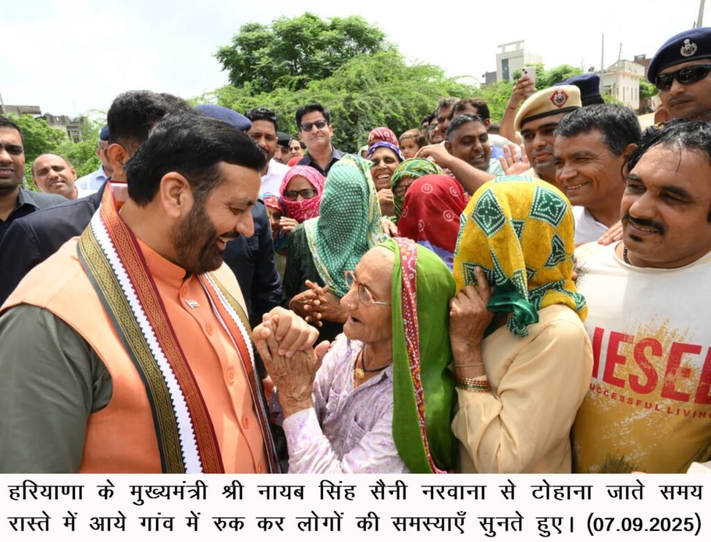 Chandigarh, September 7 — Haryana Chief Minister Nayab Singh Saini on Saturday visited waterlogged areas near Naggal village in Ambala district, interacting with affected farmers and directing officials to ensure immediate drainage of excess water.