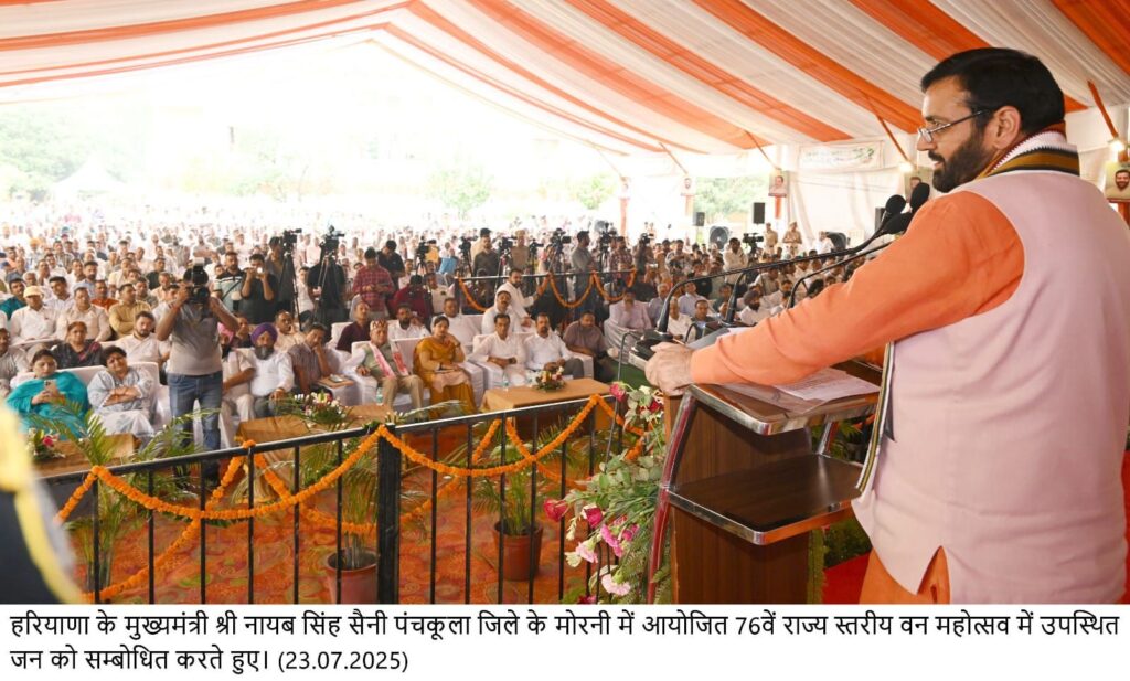 Chandigarh, July 23 — In a significant move to promote environmental conservation and sustainable living, Haryana Chief Minister Nayab Singh Saini announced an ambitious target of planting 2.10 crore trees across the state during this year’s monsoon season. Speaking at the State-level Van Mahotsav held in Morni, Panchkula district, the Chief Minister emphasized the importance of collective responsibility in environmental preservation, urging every household in the state to plant at least one tree.