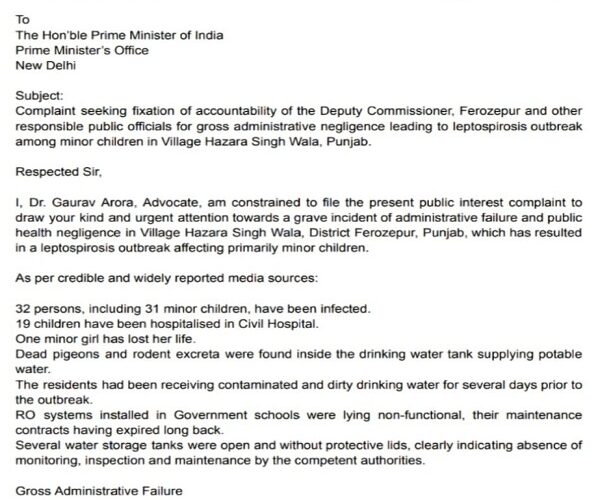National Times Bureau :- Hazara Singh Wala: A suspected case of contaminated drinking water has triggered panic in Hazara Singh Wala village after at least 32 residents fell ill and a young girl lost her life, intensifying public outrage and drawing the attention of authorities at the highest level. Villagers reported that several families began experiencing symptoms such as vomiting, diarrhoea and severe dehydration shortly after consuming tap water supplied in the area.