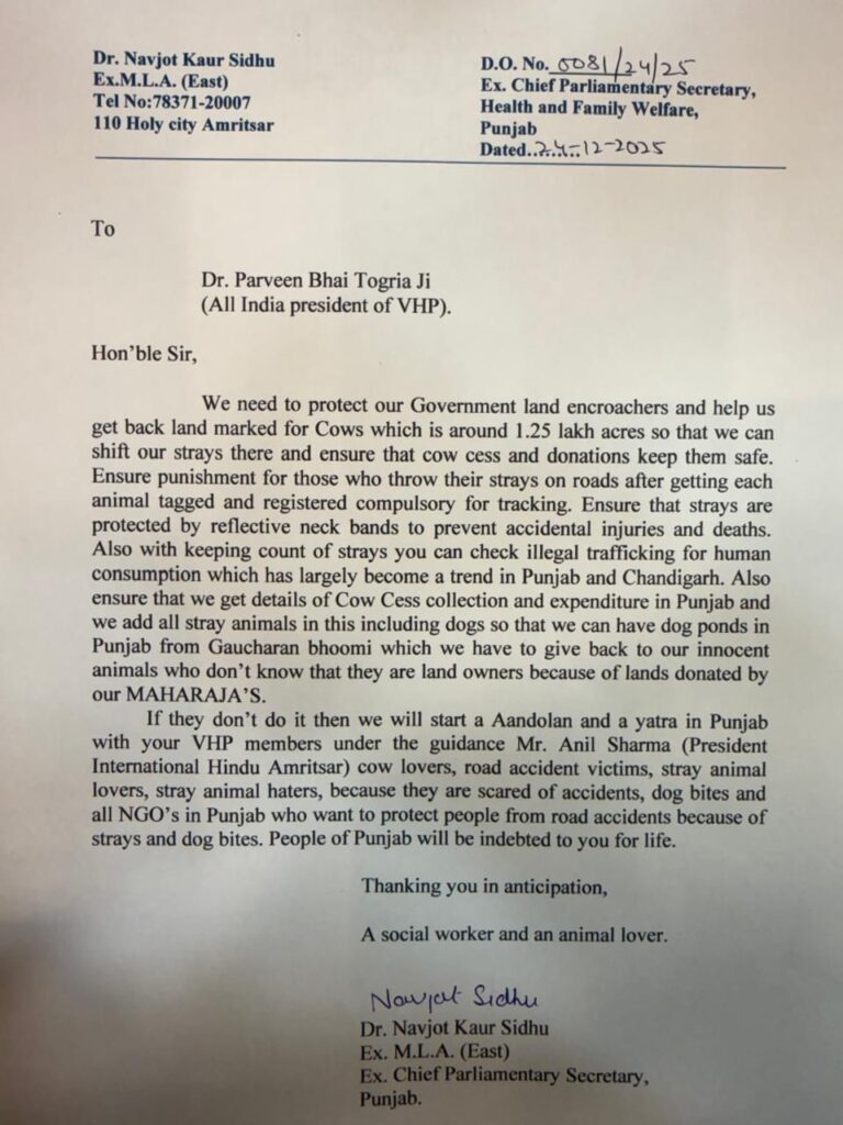 Amritsar, December 24, 2025: Former Punjab MLA and ex-Chief Parliamentary Secretary Dr Navjot Kaur Sidhu has written to Vishwa Hindu Parishad (VHP) national president Dr Parveen Bhai Togria, seeking urgent intervention to address the growing stray animal menace and alleged encroachment on government land reserved for cattle in Punjab.