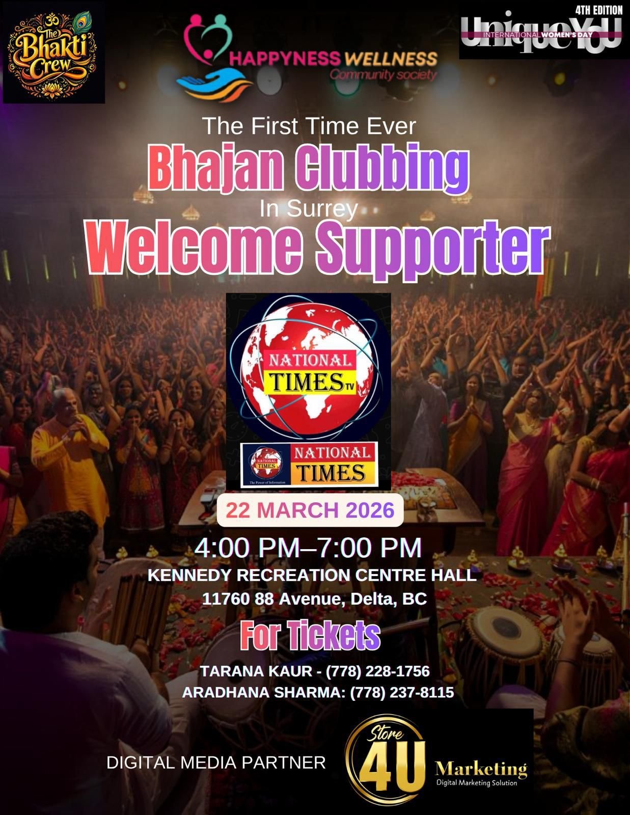 Surrey (Rajeev Sharma): In an atmosphere filled with devotion, positivity, and spiritual awakening, the Bhajan Clubbing is being presented by the Happyness & Wellness Community Society, offering the community a sacred opportunity to come together in prayer, music, and inner reflection. For the first time in Surrey, this unique concept of “Bhajan Clubbing” will be experienced, blending traditional devotional singing with a serene yet vibrant environment designed to inspire peace, joy, and a deeper divine connection. Bhakti Crew will headline this special segment, marking their first-ever performance of this concept in Surrey.