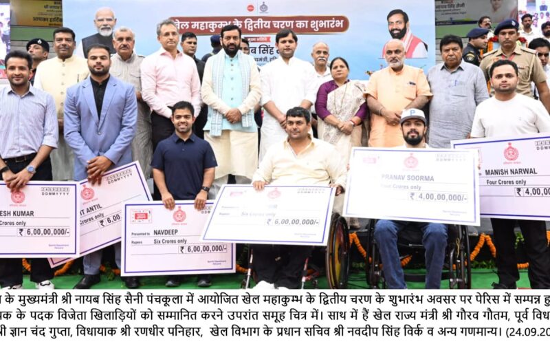 On the occasion, Saini honored Haryana’s eight medal winners from the Paris Paralympics with a total incentive of ₹42 crore. These included five gold and three silver medalists. He also awarded ₹3.56 crore to 31 coaches for their contribution and felicitated outstanding sportspersons, coaches, and nursery in-charges.