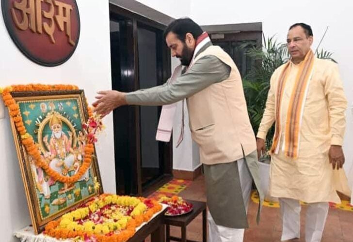 Chandigarh, October 22: Haryana Chief Minister Nayab Singh Saini performed ceremonial worship of Lord Vishwakarma at his residence, ‘Sant Kabir Kutir,’ on the occasion of Vishwakarma Day. The Chief Minister offered flowers to the deity’s portrait and paid his respects. BJP state president Mohanlal Badoli was also present during the ceremony.