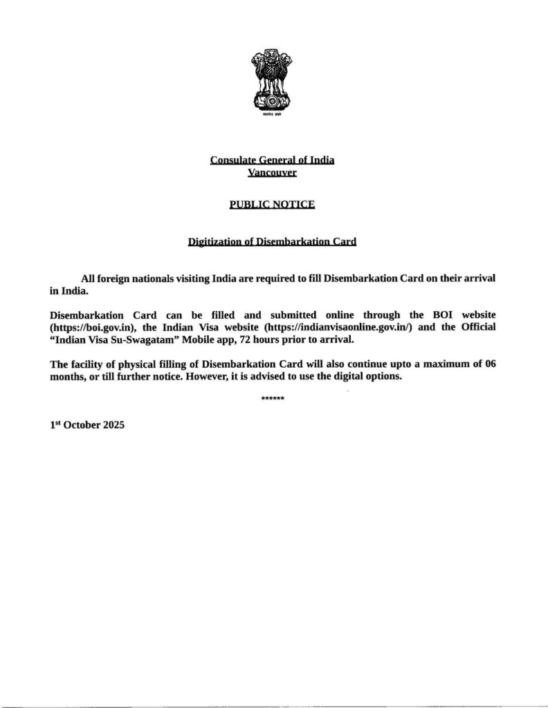 Vancouver (Rajeev Sharma): The Consulate General of India in Vancouver has issued a public notice announcing the full digitization of the Disembarkation Card process for all foreign nationals entering India. The move is aimed at streamlining immigration procedures and improving the efficiency of passenger processing at Indian airports.