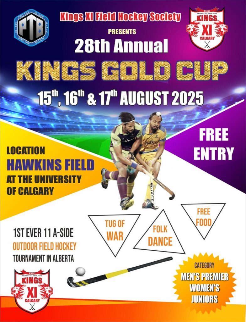 Calgary (Rajeev Sharma): The Kings XI Field Hockey Society (F.H.C) has unveiled the poster for the 28th Annual King’s Protax Block Gold Cup, a premier field hockey tournament in Western Canada. Scheduled to take place from August 15th to 17th, 2025, at Hawkins Field, University of Calgary, the event promises to showcase top field hockey talent from across the region, offering captivating matches and a vibrant community spirit. Admission to the event is complimentary for all spectators, encouraging families, fans, and sports enthusiasts to attend and support local and visiting teams.