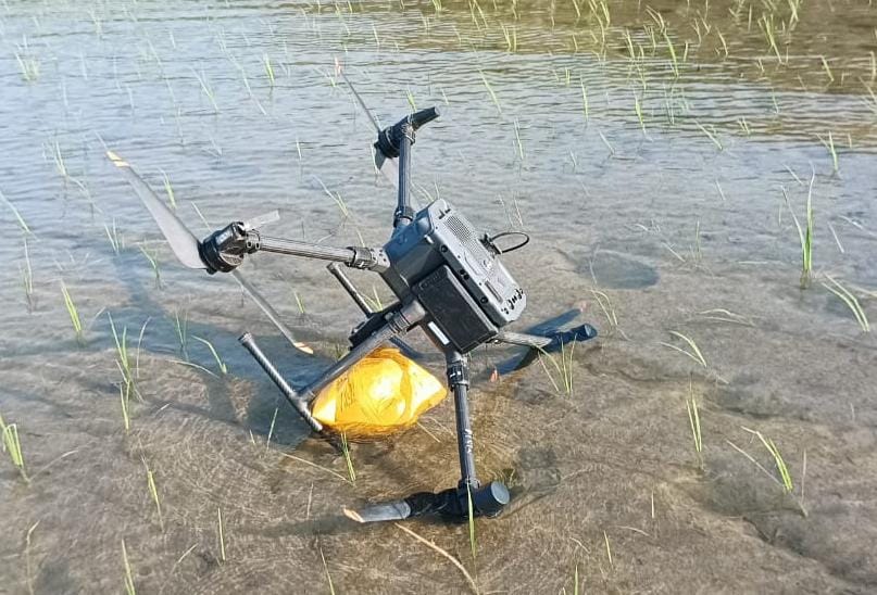 b) In another incident in the morning hours, acting on specific information, a joint search operation was conducted by the BSF and Punjab Police, which led to the recovery of 01 DJI Matrice 300 RTK drone carrying 01 large packet of heroin (Gross Weight- 3.700 Kgs) from a farming field adjacent to village- Shekhpura of district Tarn Taran. The narcotics packet, wrapped in yellow colour adhesive tape, was found attached to the drone with the help of a metal ring.