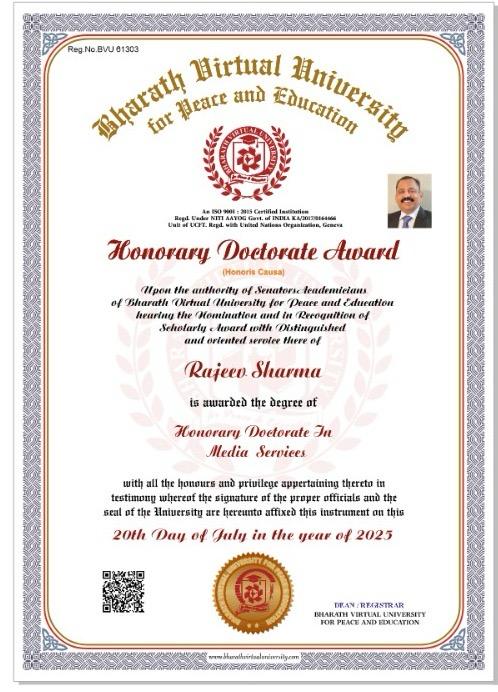 “Upon the authority of Senators and Leadership of Bharatle Virtual University for Peace and Education, and in recognition of scholarly achievement and distinguished service, Rajeev Sharma is awarded the degree of Honorary Doctorate in Media Services, with all the honours and privileges appertaining thereto. This honor is conferred on the 20th day of July in the year 2025.”