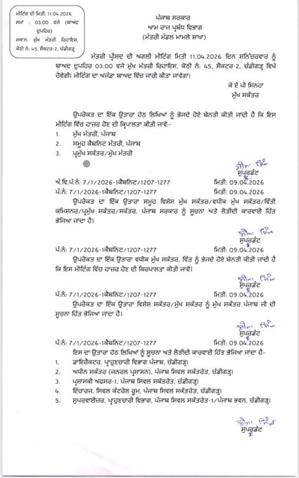 Chandigarh (Gurpreet Singh): The Punjab Government has fixed April 11, 2026, for its next Cabinet meeting, which will take place at the official residence of the Chief Minister in Chandigarh. The meeting is scheduled to commence at 3 PM.