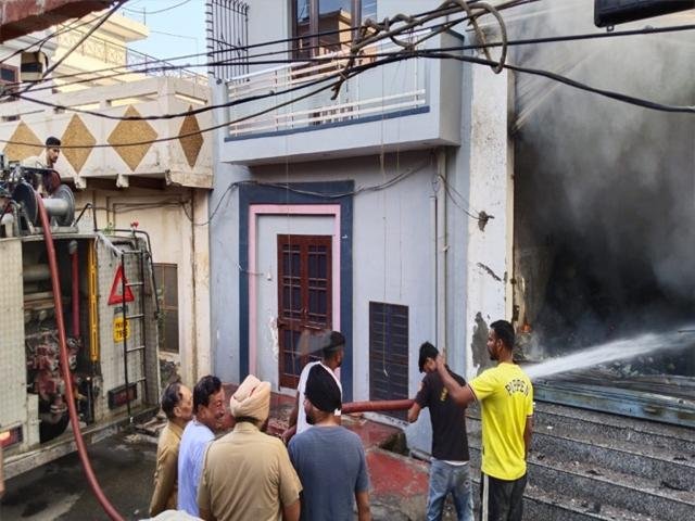 Gurpreet Singh :- A major fire broke out at a well-known ready-made garments showroom, “Hari Om Collection”, in the town, causing losses worth several lakhs, officials said. Shop owner Harinder Kumar said he received a call around 4 am from a passerby who noticed smoke billowing from the premises. By the time he reached the spot, flames had engulfed the interior and the main shutter failed to open despite repeated attempts.